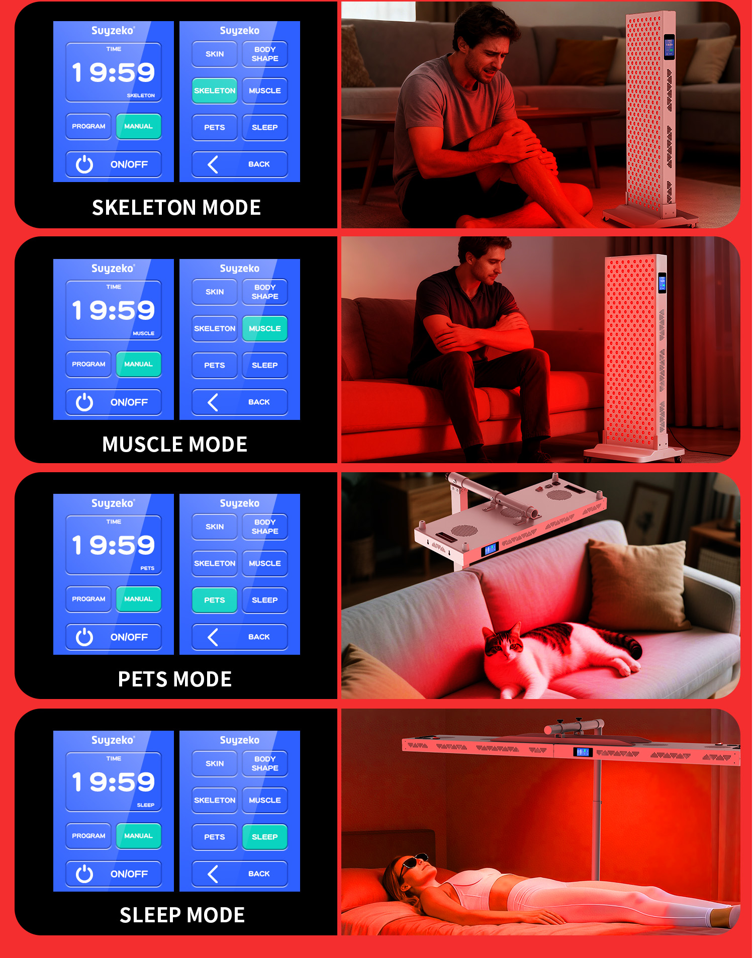 - Intelligent Touchscreen Control: A user-friendly 6-mode touchscreen interface offers presets for Sleep, Skin, Muscle, Skeleton, Body Shape, and Pet, with customizable session durations and intensity levels to suit individual needs.